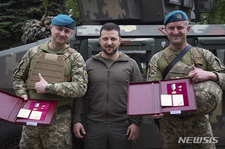 [도네츠크=AP/뉴시스] 우크라이나 대통령 공보실이 제공한 사진에 볼로디미르 젤렌스키(가운데) 대통령이 23일(현지시각) 도네츠크주를 방문해 병사들을 표창한 후 기념 촬영을 하고 있다. 2023.05.23.
