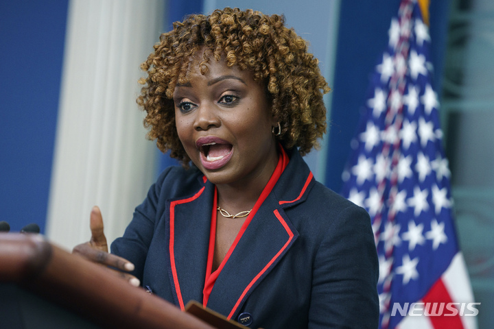 [워싱턴=AP/뉴시스] 카린 장-피에르 백악관 대변인이 23일(현지시각) 백악관에서 일일 브리핑을 하고 있다. 장-피에르 대변인은 공화당과의 부채한도 실무 협상에 관해 "바이든 대통령은 협상이 최대한 빨리 타결되길 바란다"라고 전했다. 2023.05.24.