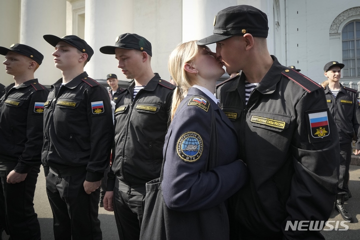 [상트페테르부르크=AP/뉴시스] 23일(현지시각) 러시아 상트페테르부르크에서 러시아군 징집병 송별식이 열려 한 징집병이 할당 부대로 떠나기 전 송별 나온 여자 친구와 입맞춤하고 있다. 블라디미르 푸틴 러시아 대통령은 봄 징집 기간 18~27세 사이 14만7000명을 징집하는 법령에 서명했다. 징집병들은 1년간 의무 복무를 해야 한다. 2023.05.24.