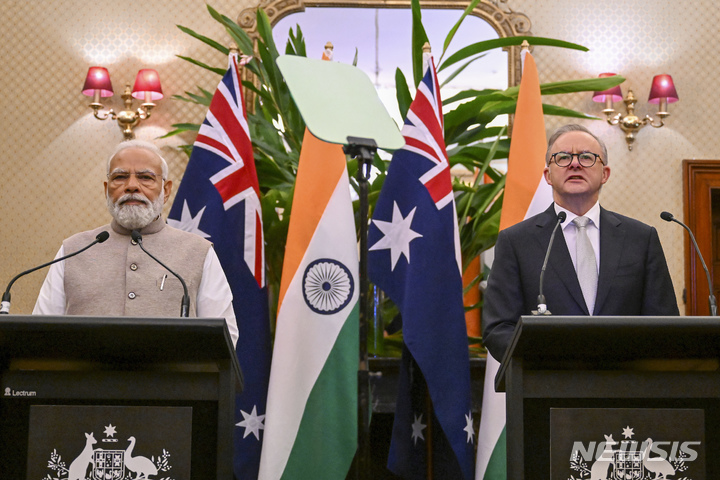 [시드니=AP/뉴시스] 나렌드라 모디(왼쪽) 인도 총리와 앤서니 앨버니지 호주 총리가 24일(현지시각) 호주 시드니 해군본부에서 양자 회담을 한 뒤 공동 기자회견을 하고 있다. 모디 총리는 시드니에 있는 힌두 사원 공격에 대한 우려를 제기하는 한편 이민 정책, 그린수소와 관련한 새로운 협정을 체결했다. 2023.05.24.