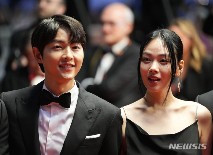 [칸=AP/뉴시스] 송중기와 김형서(비비)가 24일(현지시각) 프랑스 남부 칸에서 열린 제76회 칸 국제영화제 '주목할 만한 시선' 부문 초청작 '화란' 시사회에 도착해 포토타임을 갖고 있다. 2023.05.25.