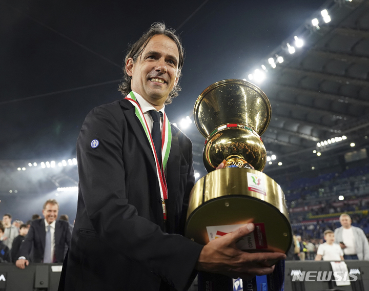 [로마=AP/뉴시스] 시모네 인차기 인테르 밀란 감독이 24일(한국시간) 이탈리아 로마의 올림피코 스타디움에서 2022-23 코파이탈리아 정상에 올라 트로피를 들고 포즈를 취하고 있다. 인테르는 결승전에서 피오렌티나를 2-1로 꺾고 우승, 2연패를 달성하며 통산 9번째 정상에 올랐다. 2023.05.25.
