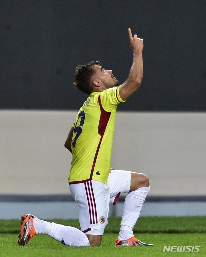 [라플라타=AP/뉴시스] 콜롬비아의 토마스 앙헬이 24일(현지시각) 아르헨티나 라플라타의 디에고 마라도나 경기장에서 열린 국제축구연맹(FIFA) 20세 이하(U20) 월드컵 C조 조별리그 2차전 일본과의 경기 후반 14분 역전 골을 넣고 세리머니하고 있다. 콜롬비아는 일본에 2-1 역전승을 거두고 2승(승점6)을 기록하며 조 1위에 올라섰다. 2023.05.25.