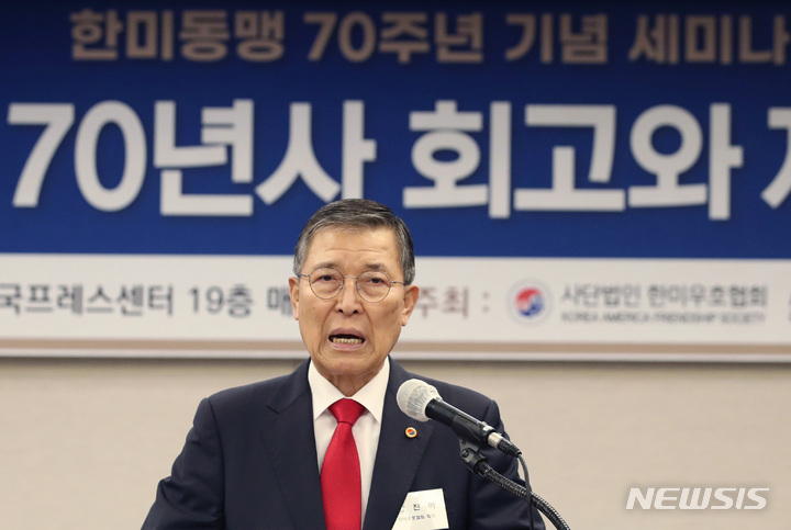 [서울=뉴시스] 김진아 기자 = 황진하 한미우호협회 회장이 25일 서울 중구 프레스센터에서 열린 '한미동맹 70주년 기념 세미나'에서 개회사를 하고 있다. 2023.05.25. [email protected]