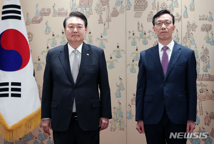 [서울=뉴시스] 홍효식 기자 = 윤석열 대통령이 25일 서울 용산 대통령실 청사에서 열린 재외공관장 신임장 수여식에서 박태영 주네팔 대사에게 신임장을 수여한 뒤 기념촬영하고 있다. 2023.05.25. [email protected]