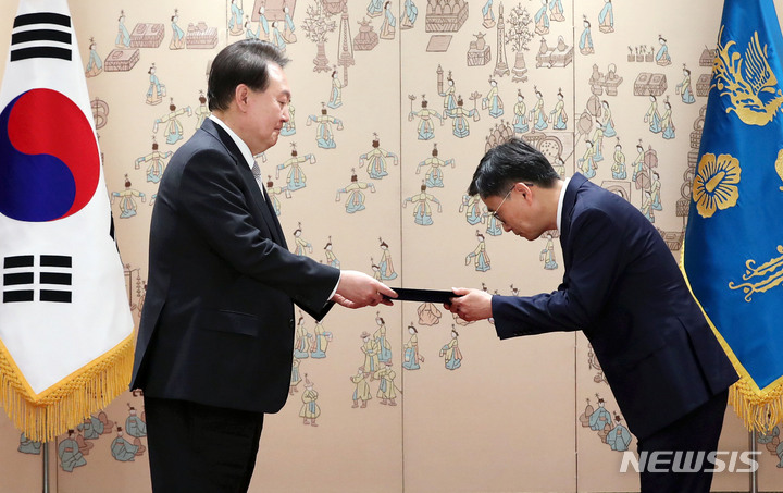 [서울=뉴시스] 홍효식 기자 = 윤석열 대통령이 25일 서울 용산 대통령실 청사에서 열린 재외공관장 신임장 수여식에서 구헌상 주바레인 대사에게 신임장을 수여하고 있다. 2023.05.25. [email protected]