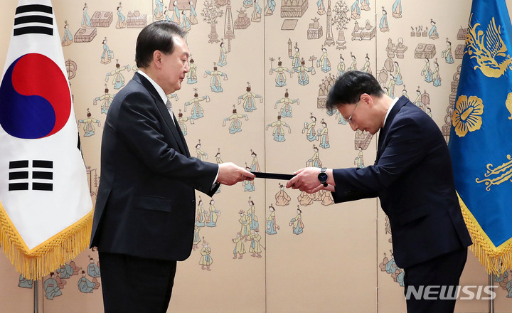 [서울=뉴시스] 홍효식 기자 = 윤석열 대통령이 25일 서울 용산 대통령실 청사에서 열린 재외공관장 신임장 수여식에서 지규택 주투르크메니스탄 대사에게 신임장을 수여하고 있다. 2023.05.25. [email protected]
