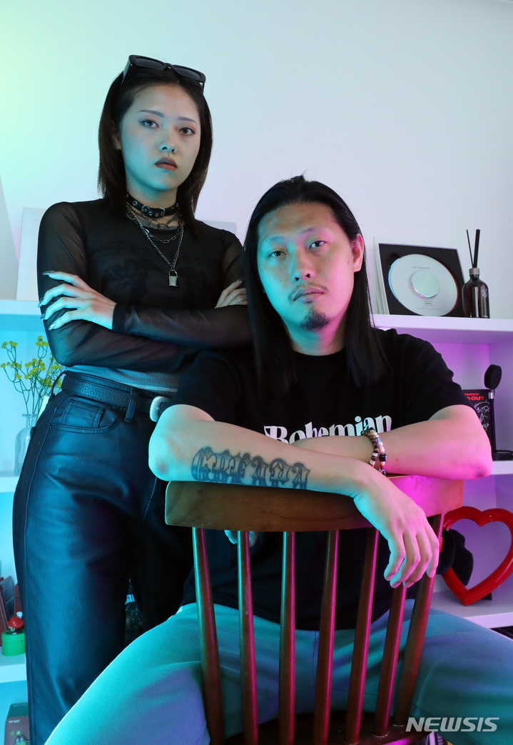 [서울=뉴시스] 김금보 기자 = 유튜버·틱톡 크리에이터로 유명세를 타고 있는 그레빠(아래)와 신체리가 지난 25일 서울 마포구 자택에서 가진 뉴시스와의 인터뷰에 앞서 포즈를 취하고 있다. 2023.06.02. [email protected]