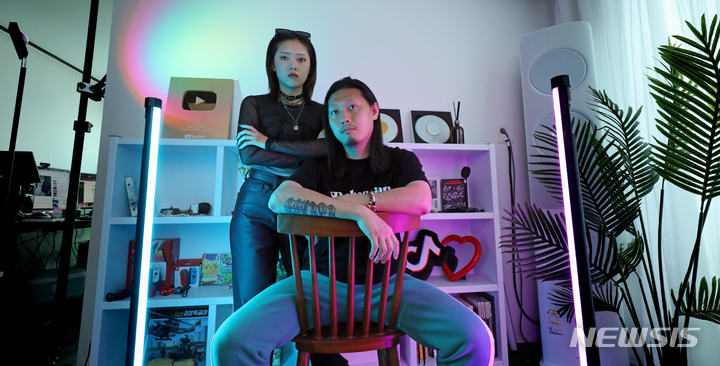[서울=뉴시스] 김금보 기자 = 유튜버·틱톡 크리에이터로 유명세를 타고 있는 그레빠(아래)와 신체리가 지난 25일 서울 마포구 자택에서 가진 뉴시스와의 인터뷰에 앞서 포즈를 취하고 있다. 2023.06.02. [email protected]