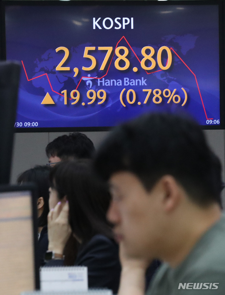 [서울=뉴시스] 황준선 기자 = 30일 코스피가 전 거래일(2558.81)보다 23.60포인트(0.92%) 오른 2582.41에 개장했다. 코스닥지수는 전 거래일(832.23)보다 6.77포인트(0.80%) 오른 850.00에 거래를 시작했다. 원·달러 환율은 전 거래일(1321.1)보다 1.9원 오른 1323.0원에 출발했다. 이날 오전 서울 중구 하나은행 딜링룸에 지수가 표시돼 있다. 2023.05.30. [email protected]
