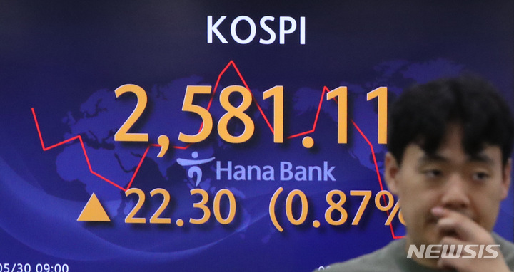 [서울=뉴시스] 황준선 기자 = 30일 코스피가 전 거래일(2558.81)보다 23.60포인트(0.92%) 오른 2582.41에 개장했다. 코스닥지수는 전 거래일(832.23)보다 6.77포인트(0.80%) 오른 850.00에 거래를 시작했다. 원·달러 환율은 전 거래일(1321.1)보다 1.9원 오른 1323.0원에 출발했다. 이날 오전 서울 중구 하나은행 딜링룸에 지수가 표시돼 있다. 2023.05.30. [email protected]