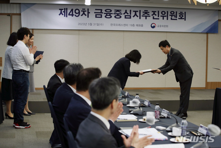 [서울=뉴시스] 고승민 기자 = 김주현 금융위원장이 31일 서울 프레스센터에서 열린 제49차 금융중심지추진위원회에서 신규 위원들에게 위촉장을 수여하고 있다. 2023.05.31. [email protected]
