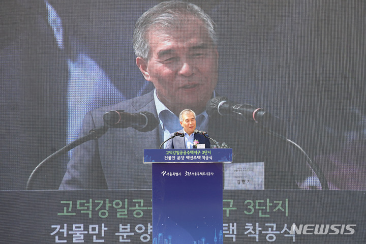 [서울=뉴시스] 권창회 기자 = 김현기 서울시의회 의장이 31일 오후 서울 강동구 고덕강일 공공주택지구 3단지 현장에서 열린 건물만 분양 백년주택 착공식에서 축사를 하고 있다. 2023.05.31. [email protected]