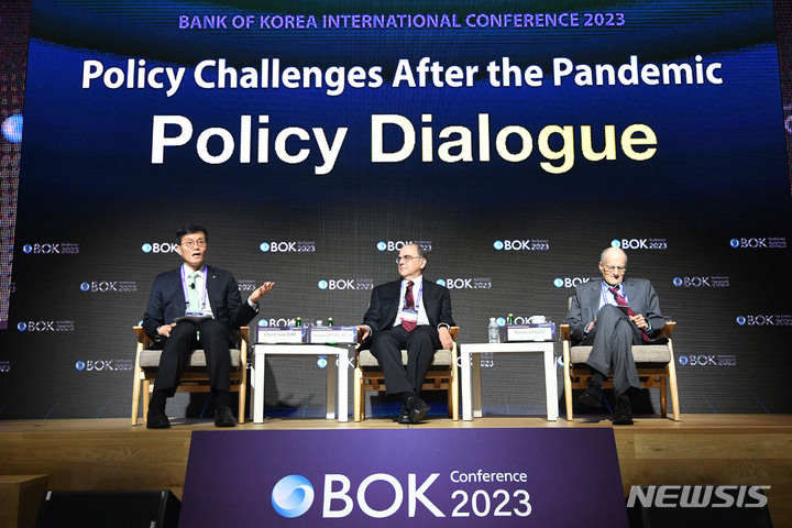 [서울=뉴시스] 사진공동취재단 = 이창용 한국은행 총재가 1일 오전 서울 중구 한국은행 별관에서 '팬데믹 이후의 정책과제(Policy Challenges After the Pandemic)'라는 주제로 열린 2023년 BOK 국제컨퍼런스에 참석해 정책 대담을 하고 있다. 왼쪽부터 이창용 한국은행 총재, 나라야나 코처라코타 교수, 토마스 사전트 교수. 2023.06.01. [email protected]