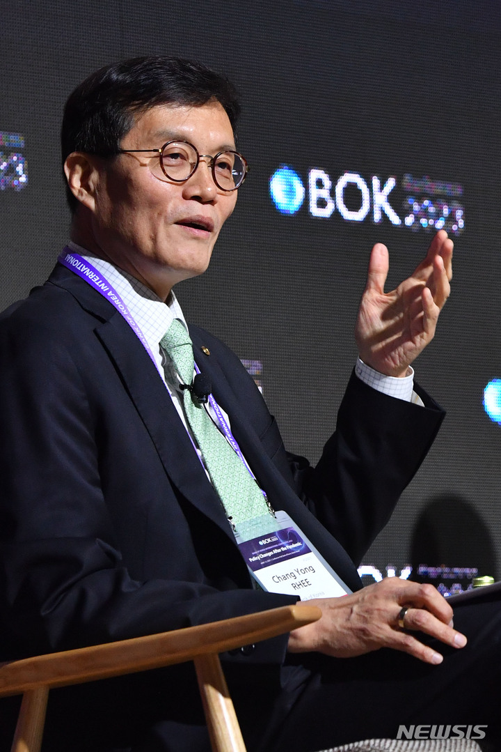 [서울=뉴시스] 사진공동취재단 = 이창용 한국은행 총재가 1일 오전 서울 중구 한국은행 별관에서 '팬데믹 이후의 정책과제(Policy Challenges After the Pandemic)'라는 주제로 열린 2023년 BOK 국제컨퍼런스에 참석해 정책 대담을 하고 있다. 2023.06.01. [email protected]