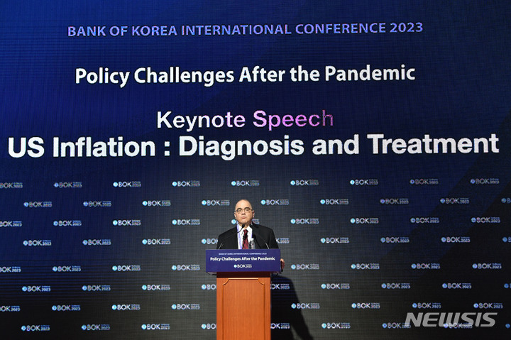 [서울=뉴시스] 사진공동취재단 = 나라야나 코처라코타 교수가 1일 오전 서울 중구 한국은행 별관에서 '팬데믹 이후의 정책과제(Policy Challenges After the Pandemic)'라는 주제로 열린 2023년 BOK 국제컨퍼런스에 참석해 기조연설을 하고 있다. 2023.06.01. [email protected]