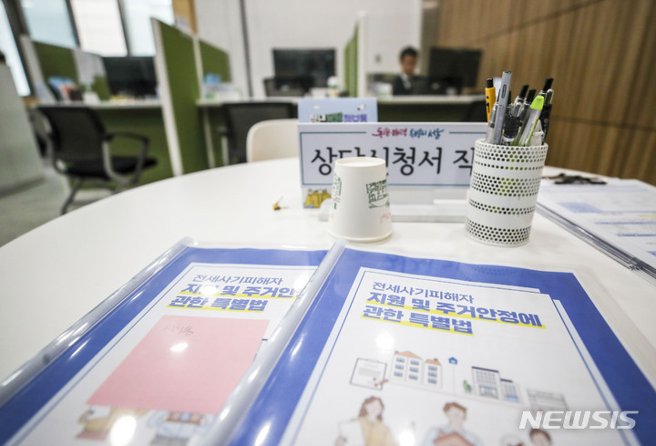 [서울=뉴시스] 정병혁 기자 = 전세사기 피해자 지원 특별법이 시행됨에 따라, 전세사기 피해자는 연체정보 등록유예, 전세대출 20년 무이자 대환 등 금융지원을 받을 수 있게 된다. 금융위원회는 우선 전세사기로 인해 보증금을 돌려받지 못해 전세대출 상환에 어려움을 겪는 피해자들이 정상적인 금융생활을 영위할 수 있도록 은행 등 전세대출을 취급한 금융기관에서 연체정보 등록이 유예하고, 상환하지 못한 전세대출 채무에 대해서는 분할상환약정을 주택금융공사나 SGI서울보증 등 보증사와 체결하면 최장 20년간 무이자 분할상환이 가능하다. 1일 오전 서울 중구 서소문청사에 설치된 전월세종합지원센터에 전세사기 특별법 관련 안내문이 비치되어 있다. 2023.06.01. [email protected]