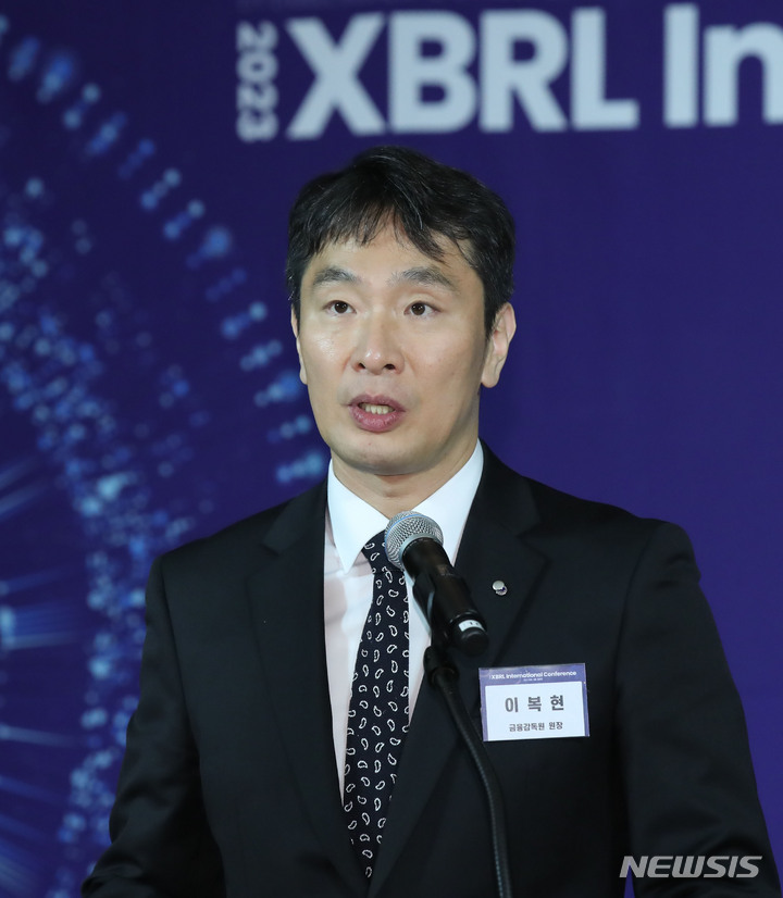 [서울=뉴시스] 조수정 기자 = 이복현 금융감독원장이 1일 오후 서울 영등포구 63빌딩에서 열린 2023 XBRL 국제컨퍼런스에서 개회사 하고 있다. 2023.06.01. [email protected]