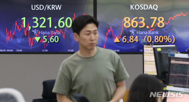 [서울=뉴시스] 권창회 기자 =  원·달러 환율이 전 거래일보다 5.6원 낮아진 1321.6원에 마감했다. 코스피는 7.95포인트(0.31%) 하락한 2569.17, 코스닥 지수는 6.84포인트(0.80%) 상승한 863.78에 마감했다. 1일 오후 서울 중구 하나은행 딜링룸에서 딜러들이 업무를 보고 있다. 2023.06.01. [email protected]