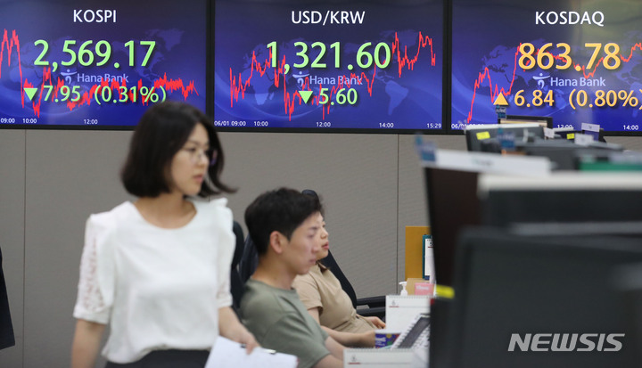 [서울=뉴시스] 권창회 기자 = 코스피가 전 거래일 대비 7.95포인트(0.31%) 하락한 2569.17에 마감했다. 원달러 환율은 5.6원 낮아진 1321.6원으로, 코스닥지수는 6.84포인트(0.80%) 상승한 863.78에 거래를 마감했다. 1일 오후 서울 중구 하나은행 딜링룸에서 딜러들이 업무를 보고 있다. 2023.06.01. [email protected]