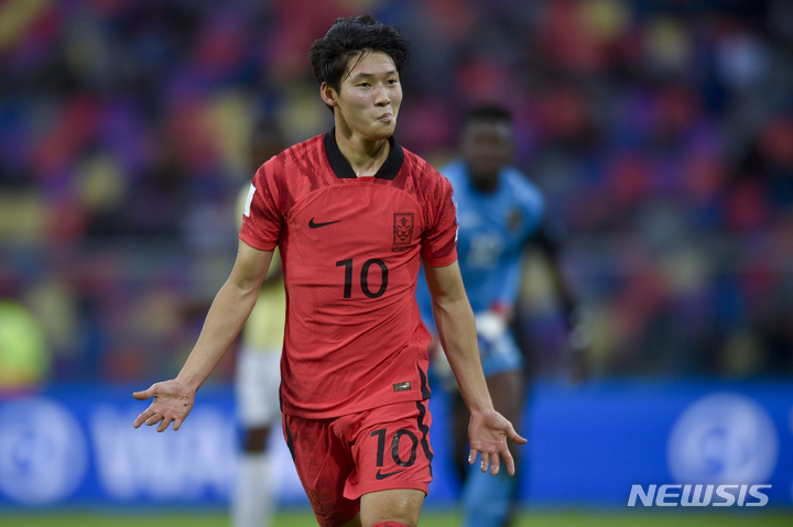 [산티아고 델 에스테로=AP/뉴시스] 배준호가 1일(현지시각) 아르헨티나의 산티아고 델 에스테로 스타디움에서 열린 2023 국제축구연맹(FIFA) 20세 이하(U20) 월드컵 16강전 에콰도르와의 경기 전반 19분 팀의 두 번째 골을 넣고 기뻐하고 있다. 한국은 에콰도르를 3-2로 꺾고 8강에 올라 나이지리아를 상대한다. 2023.06.02.