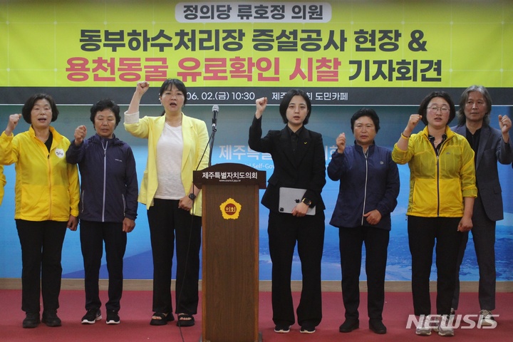 [제주=뉴시스] 양영전 기자 = 정의당 류호정 의원과 당 관계자 등이 2일 오전 제주시 연동 제주도의회에서 기자회견을 열고 구호를 외치고 있다. 류 의원은 이날 제주시 구좌읍 월정리 용천동굴 하류구간을 유네스코 자연유산에 등재해야 한다고 촉구했다. 2023.06.02. [email protected]