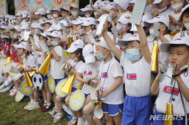 [평양=AP/뉴시스] 1일 북한 평양의 대성산유원지에서 제73회 국제아동절 행사가 열려 어린이들이 응원하고 있다. '국제아동절'은 1949년 9월 러시아 모스크바에서 제정된 사회주의 국가의 '어린이날'이다. 2023.06.02.