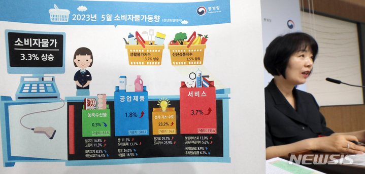 [세종=뉴시스] 강종민 기자 = 김보경 통계청 경제동향통계심의관이 2일 세종시 정부세종청사에서 2023년 5월 소비자물가동향을 발표하고 있다. 지난달 소비자물가는 전년동월대비 3.3% 상승하며 2개월 연속 3%대에 머물렀다. 2023.06.02. [email protected]