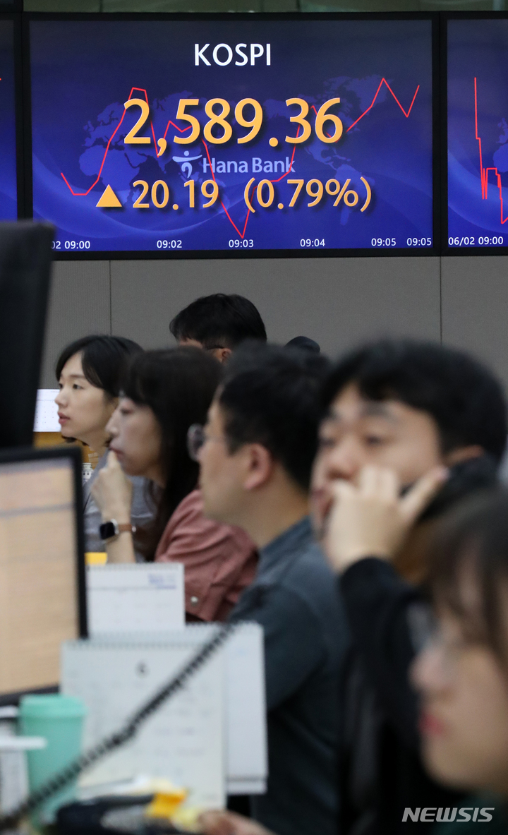 [서울=뉴시스] 김명년 기자 = 코스피가 전 거래일(2569.17)보다 17.10포인트(0.67%) 오른 2586.27에 개장한 2일 오전 서울 중구 하나은행 딜링룸에서 딜러들이 업무를 보고 있다. 코스닥 지수는 전 거래일(863.78)보다 2.38포인트(0.28%) 상승한 866.16에 거래를 시작했다. 원·달러 환율은 전 거래일(1321.6원)보다 8.6원 내린 1313.0원에 출발했다. 2023.06.02. [email protected]