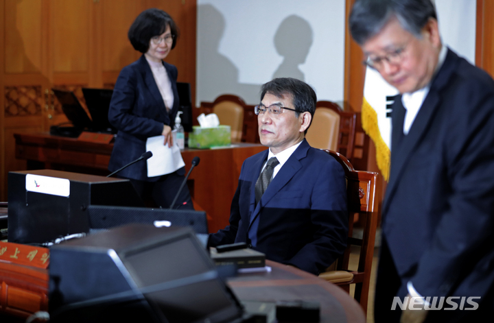 [과천=뉴시스] 김금보 기자 = 노태악 중앙선거관리위원장이 2일 오전 경기 과천시 중앙선거관리위원회에서 열리는 고위직 간부 자녀 특혜 채용 의혹 관련 위원회의 참석하고 있다. 2023.06.02. [email protected]