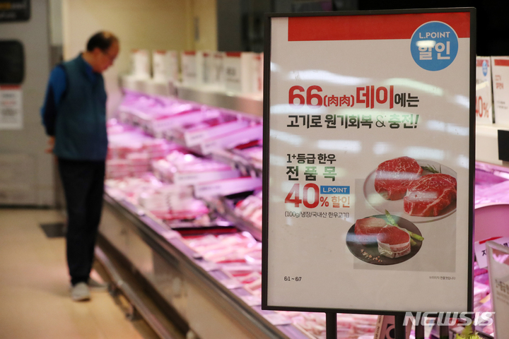 [서울=뉴시스] 김명년 기자 = 2일 오전 서울 용산구 롯데마트 서울역점에서 시민들이 고기를 구매하고 있다. 롯데마트는 6월 6일 육육(肉肉)데이를 맞아 오는 7일까지 다양한 육류를 최대 50% 할인 판매한다. 2023.06.02. [email protected]