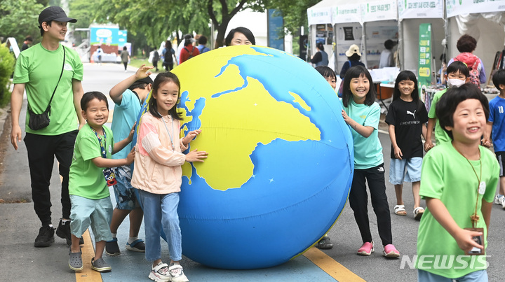 [수원=뉴시스] 김종택 기자 = 환경의 날을 사흘 앞둔 2일 경기도 수원시 권선구 상상캠퍼스에서 열린 '2023경기도 환경교육주간'행사에서 어린이들이 지구본 풍선을 굴리고 있다. 오는 3일까지 열리는 이번 행사는 환경정책설명회, 폐자원 업사이클체험 등 다양한 프로그램이 진행된다. 2023.06.02. [email protected]