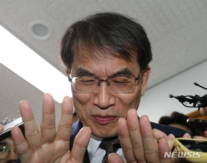 [과천=뉴시스] 김금보 기자 = 노태악 중앙선거관리위원장이 2일 오전 경기 과천시 중앙선거관리위원회에서 열린 고위직 간부 자녀 특혜 채용 의혹 관련 위원회의를 마치고 나오며 취재진에게 질문 세례를 받고 있다. 2023.06.02. [email protected]