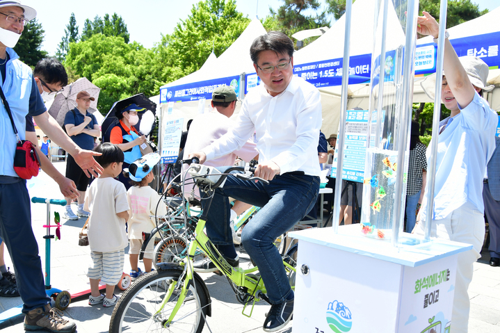 [서울=뉴시스] 고승민 기자 = 오승록 서울 노원구청장이 3일 서울 노원구 중계동 등나무문화공원에서 진행된 ‘2023 노원 탄소중립 한마당’ 행사에 참석해 자전거 발전기를 체험하고 있다. (사진=노원구 제공) 2023.06.03. [email protected] *재판매 및 DB 금지