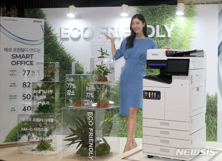 [서울=뉴시스] 김선웅 기자 = 한국 엡손이 5일 서울 서초구 JW메리어트 호텔 그랜드볼룸에서 비즈니스젯 컬러복합기 AM-C 시리즈 3종(▲AM-C4000, ▲AM-C5000, ▲AM-C6000)을 선보이고 있다. 신제품 3종은 인쇄 과정에서 프린터 헤드에 열을 사용하지 않고 잉크를 분사해 출력하는 엡손의 '히트프리'기술이 탑재돼 레이저 프린터 대비 연간 소비전력 및 탄소배출량을 최대 77% 절감할 수 있다. 또한 폐기물을 최대 82% 절감해 고품질 인쇄작업과 동시에 자원을 절약해 친환경적 사용이 가능하다. 2023.06.05. [email protected]