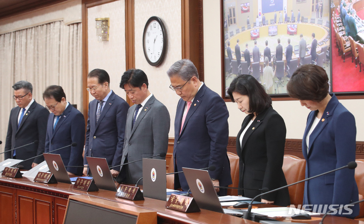 [서울=뉴시스] 김명원 기자 = 추경호 경제부총리 겸 기획재정부 장관, 이주호 사회부총리 겸 교육부 장관 및 국무위원들이 5일 서울 종로구 정부서울청사에서 세종-서울 영상으로 열린 국무회의에 참석해 6월 호국보훈의 달을 맞아 순국선열에 대한 묵념을 하고 있다. 2023.06.05. [email protected]