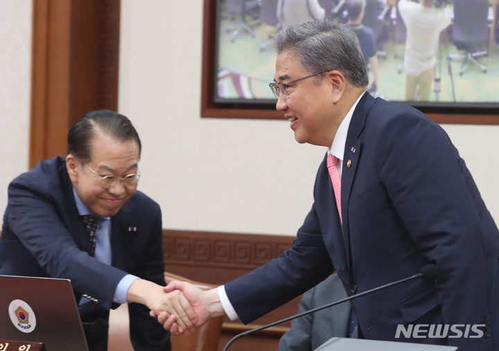 [서울=뉴시스] 김명원 기자 = 박진(오른쪽) 외교부 장관과 권영세 통일부 장관이 5일 서울 종로구 정부서울청사에서 세종-서울 영상으로 열린 국무회의에 참석해 인사하고 있다. 2023.06.05. [email protected]