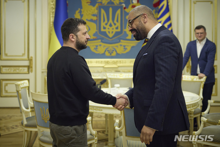 [키이우=AP/뉴시스] 볼로디미르 젤렌스키(왼쪽) 우크라이나 대통령이 5일(현지시각) 키이우를 방문한 제임스 클레벌리 영국 외무부 장관과 악수하고 있다. 클레벌리 장관은 젤렌스키 대통령과 다음 달 리투아니아에서 열리는 북대서양조약기구(나토·NATO) 정상회담을 위한 준비와 러시아의 침공을 끝내기 위한 우크라이나의 계획에 대해 논의했다. 2023.06.06.