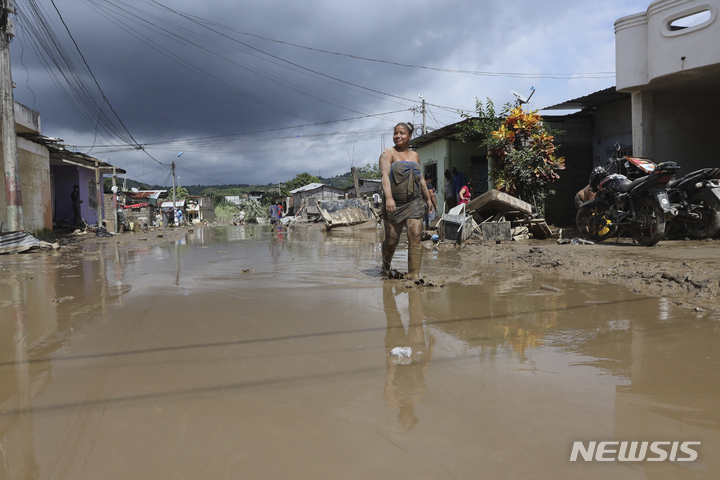 [에스메랄다스=AP/뉴시스] 5일(현지시각) 에콰도르 에스메랄다스에 홍수가 발생한 후 흙탕물 투성이의 한 주민이 침수된 도로를 걷고 있다. 에스메랄다스주에 12시간 동안 이어진 폭우로 6개의 강이 범람하고 500여 주민이 대피했다. 지금까지 사망자나 실종자에 대한 보고는 없는 것으로 알려졌다. 2023.06.06.