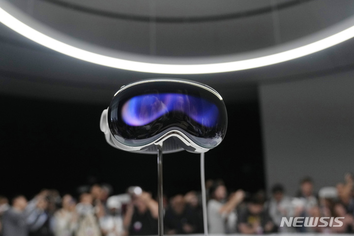 [쿠퍼티노=AP/뉴시스] 애플이 5일(현지시각) 미 캘리포니아주 쿠퍼티노의 애플 파크에서 열린 연례 세계 개발자 회의(WWDC)에서 혼합현실(MR) 헤드셋 '비전 프로'를 공개하고 있다. 팀 쿡 최고경영자(CEO)는 "'비전 프로'로 디지털 콘텐츠가 물리적 공간에 있는 것처럼 상호 작용하고, 사용자의 눈동자와 손, 목소리로 이를 조종할 수 있다"라고 밝혔다. 2023.06.06.