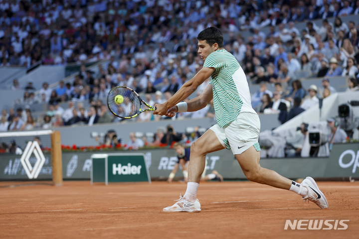 [파리=AP/뉴시스] 카를로스 알카라스(1위·스페인)가 6일(현지시각) 프랑스 파리의 스타드 롤랑가로스에서 열린 프랑스오픈 테니스 남자 단식 8강전에서 스테파노스 치치파스(5위·그리스)와 경기하고 있다. 알카라스가 치치파스를 3-0(6-2 6-1 7-6<7-5>)으로 꺾고 4강에 올라 노바크 조코비치(3위·세르비아)와 사실상의 결승전을 벌인다. 2023.06.07.