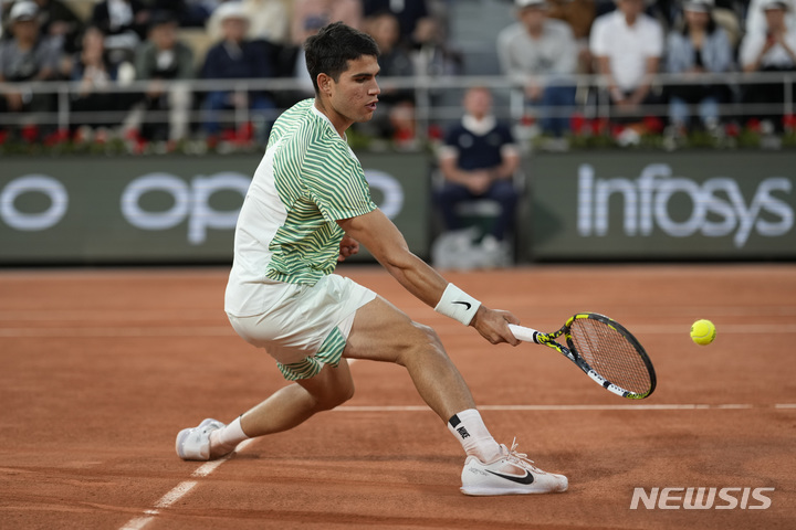 [파리=AP/뉴시스] 카를로스 알카라스(1위·스페인)가 6일(현지시각) 프랑스 파리의 스타드 롤랑가로스에서 열린 프랑스오픈 테니스 남자 단식 8강전에서 스테파노스 치치파스(5위·그리스)와 경기하고 있다. 알카라스가 치치파스를 3-0(6-2 6-1 7-6<7-5>)으로 꺾고 4강에 올라 노바크 조코비치(3위·세르비아)와 사실상의 결승전을 벌인다. 2023.06.07.