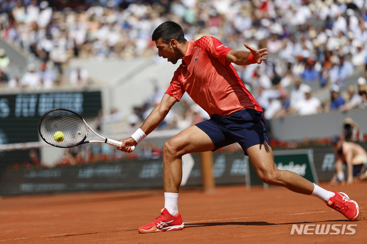 [파리=AP/뉴시스] 노바크 조코비치(3위·세르비아)가 6일(현지시각) 프랑스 파리의 스타드 롤랑가로스에서 열린 프랑스오픈 테니스 남자 단식 8강전에서 카렌 하차노프(11위·러시아)와 경기하고 있다. 조코비치는 카차노프를 3-1(4-6 7-6<7-0> 6-2 6-4)로 꺾고 4강에 올라 카를로스 알카라스(1위·스페인)와 사실상의 결승전을 치른다. 2023.06.07.