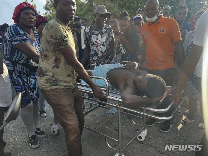 [제레미=AP/뉴시스] 6일(현지시각) 아이티 제레미 주민들이 지진으로 무너진 집에서 부상자를 구조해 옮기고 있다. 아이티 남서부 아브리코 인근 해상에서 규모 4.9의 지진이 발생해 최소 4명이 숨지고 36명이 다친 것으로 나타났다. 2023.06.07.