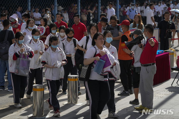 [베이징=AP/뉴시스] 중국의 대학입시 '가오카오' 첫날인 7일 중국 베이징에서 자원봉사자들이 수험장으로 들어가는 학생들을 안내하고 있다. 중국 전역에서 치러지는 가오카오는 8일까지 이어지며 올해 수험생은 1천291만 명으로 역대 최다를 기록했다. 2023.06.07.