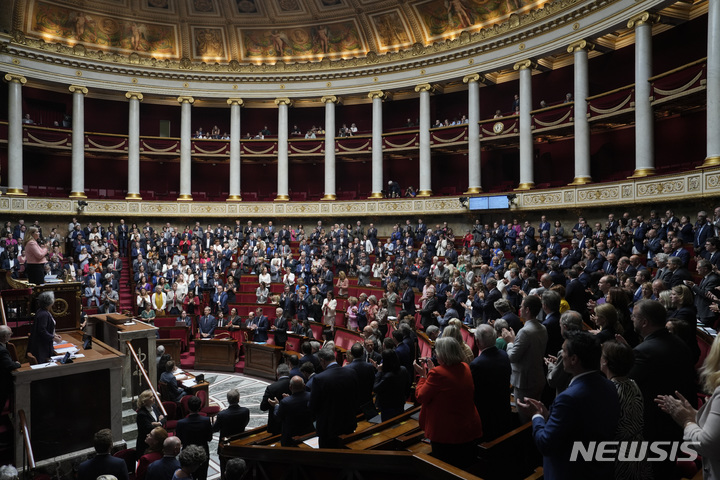 [파리=AP/뉴시스] 8일(현지시각) 프랑스 파리 의회에서 국회의원들이 알프스 마을에서 흉기 공격으로 다친 어린이들을 위로하는 박수를 하고 있다. 경찰은 이날 알프스산맥 자락 휴양지 안시 호수 인근 놀이터에서 흉기를 든 괴한이 어린이들을 공격해 어린이 4명과 성인 한 명이 다쳤으며 이중 최소 3명은 중태라고 밝혔다. 흉기를 휘두른 괴한은 경찰에 체포됐다. 2023.06.08.