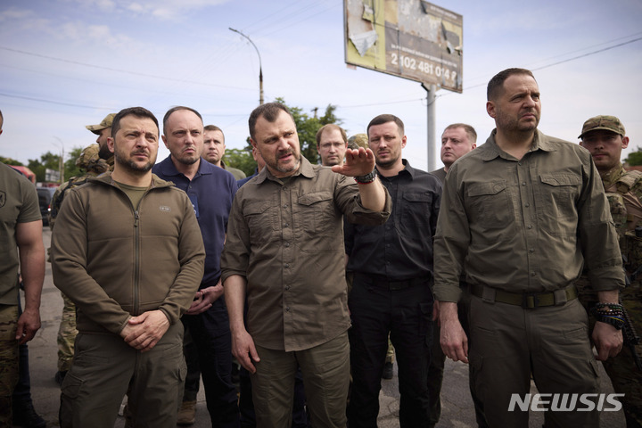 [헤르손=AP/뉴시스] 우크라이나 대통령실이 제공한 사진에 볼로디미르 젤렌스키 우크라이나 대통령이 8일(현지시각) 헤르손의 홍수 피해 지역을 방문해 둘러보고 있다. 2023.06.08.