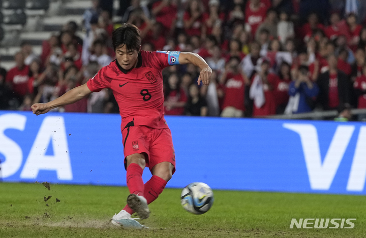 [라플라타=AP/뉴시스] 이승원이 8일(현지시각) 아르헨티나 라 플라타의 디에고 마라도나 스타디움에서 열린 2023 국제축구연맹(FIFA) 20세 이하(U20) 월드컵 4강 이탈리아와의 경기 전반 23분 PK로 동점 골을 넣고 있다. 2023.06.09.