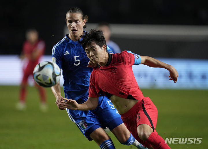 [라플라타=AP/뉴시스] 이승원(오른쪽)이 8일(현지시각) 아르헨티나 라 플라타의 디에고 마라도나 스타디움에서 열린 2023 국제축구연맹(FIFA) 20세 이하(U20) 월드컵 4강 이탈리아와의 경기 중 공을 쫓고 있다. 2023.06.09.