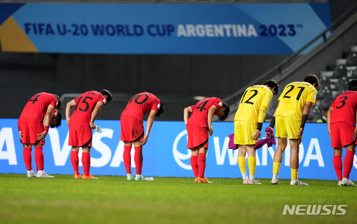 [라플라타=AP/뉴시스] 한국 선수들이 8일(현지시각) 아르헨티나 라 플라타의 디에고 마라도나 스타디움에서 열린 2023 국제축구연맹(FIFA) 20세 이하(U20) 월드컵 4강전에서 이탈리아에 패한 후 응원단에 인사하고 있다. 전반을 1-1로 마친 한국은 후반 41분 시모네 파푼디에게 통한의 프리킥 결승 골을 내주며 1-2로 패해 이스라엘과 3~4위전을 치른다. 2023.06.09.